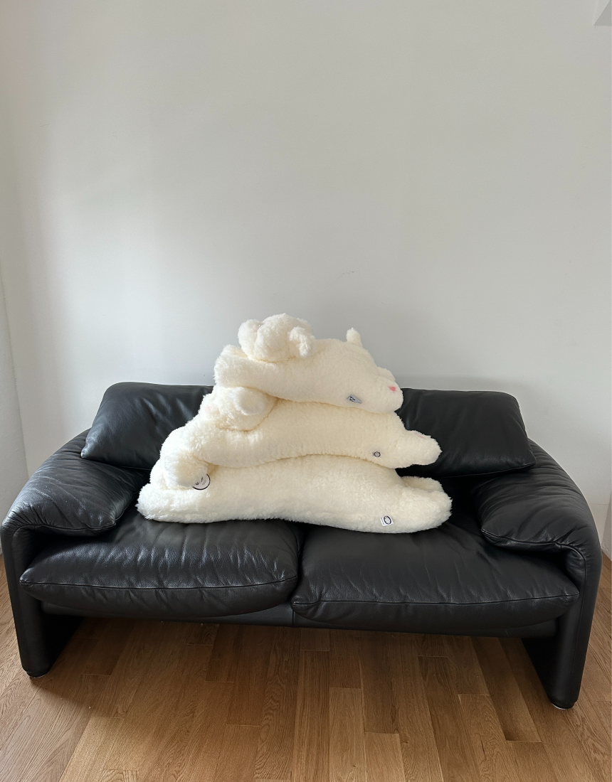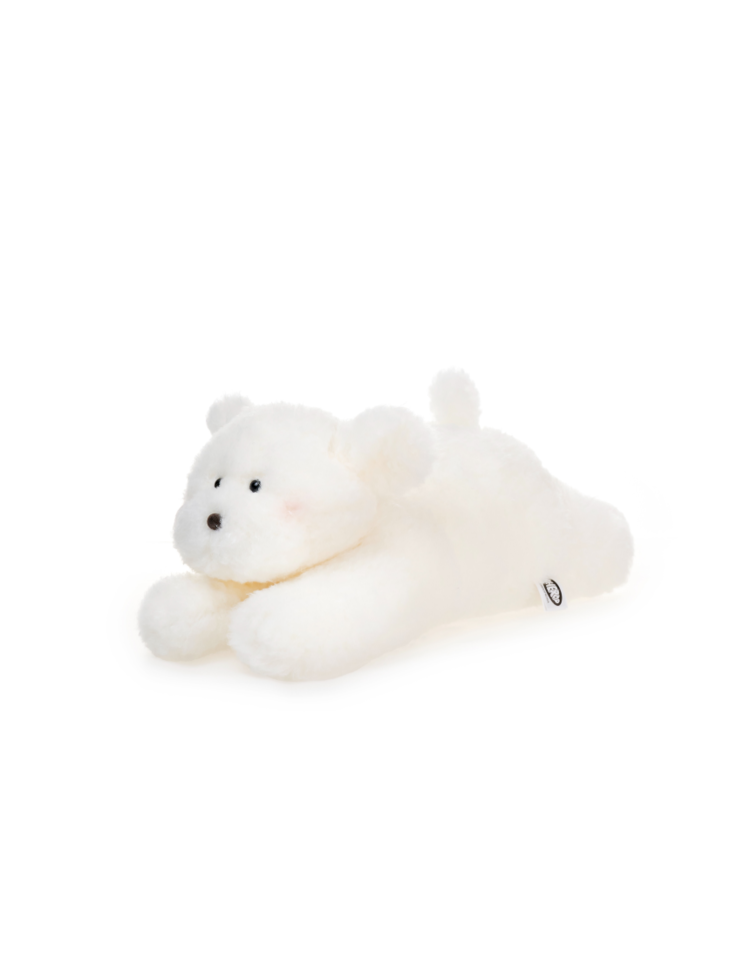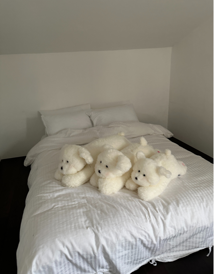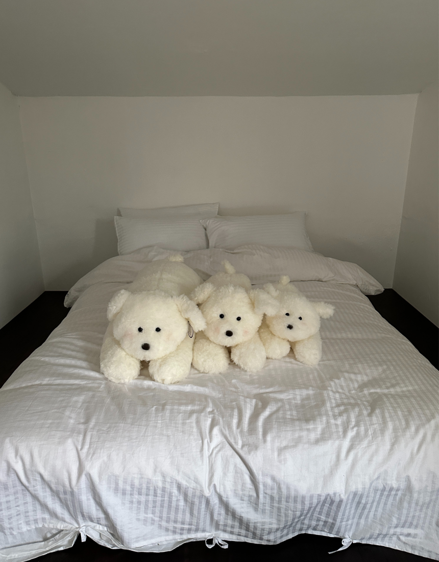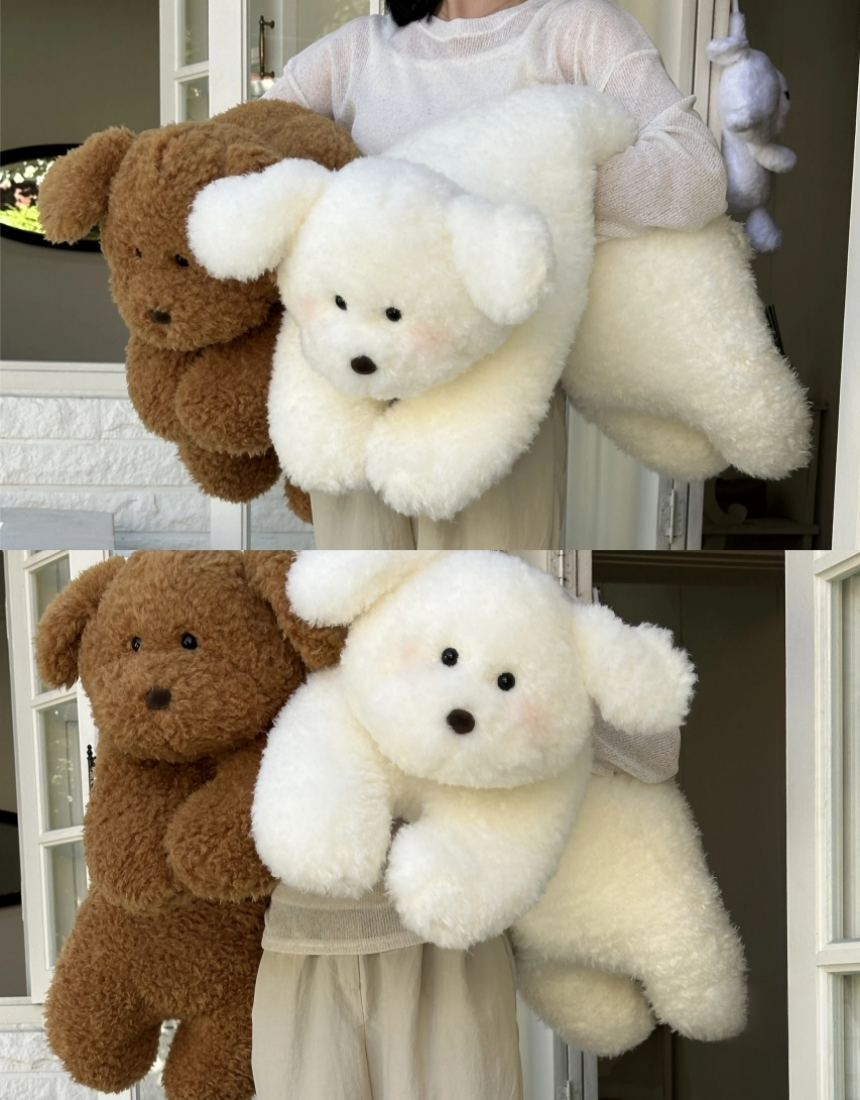 엎드려 있는 자세의 플라잉 버전 몽모.실제 비숑을 떠올리게 하는 몽실몽실한 촉감이 특징.핑크 발바닥 하트 속 mongmo 이름 자수로 귀여운 포인트 완성.